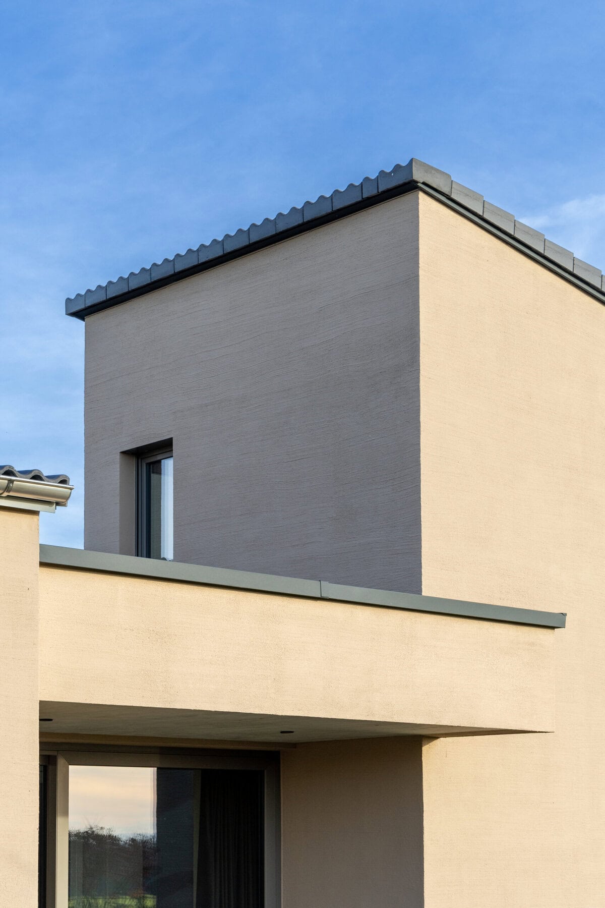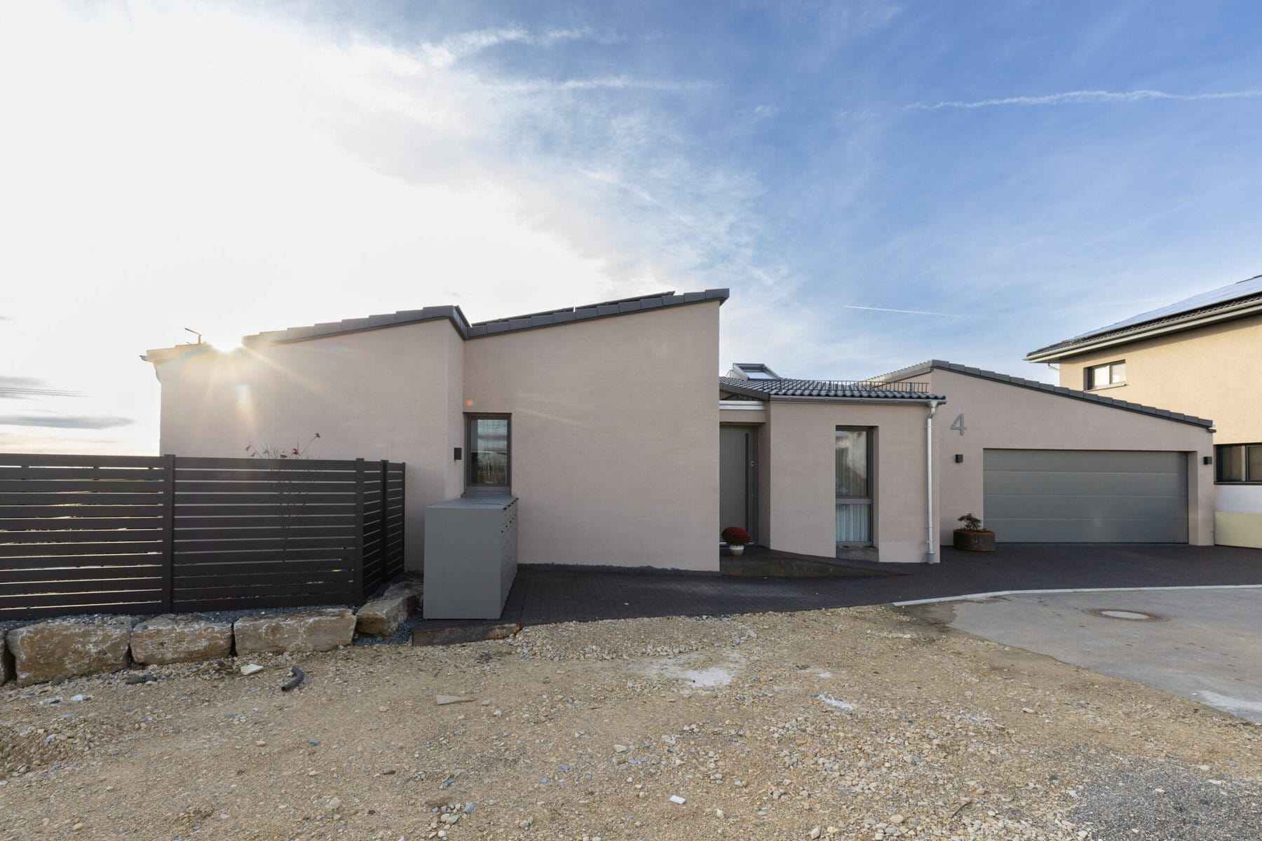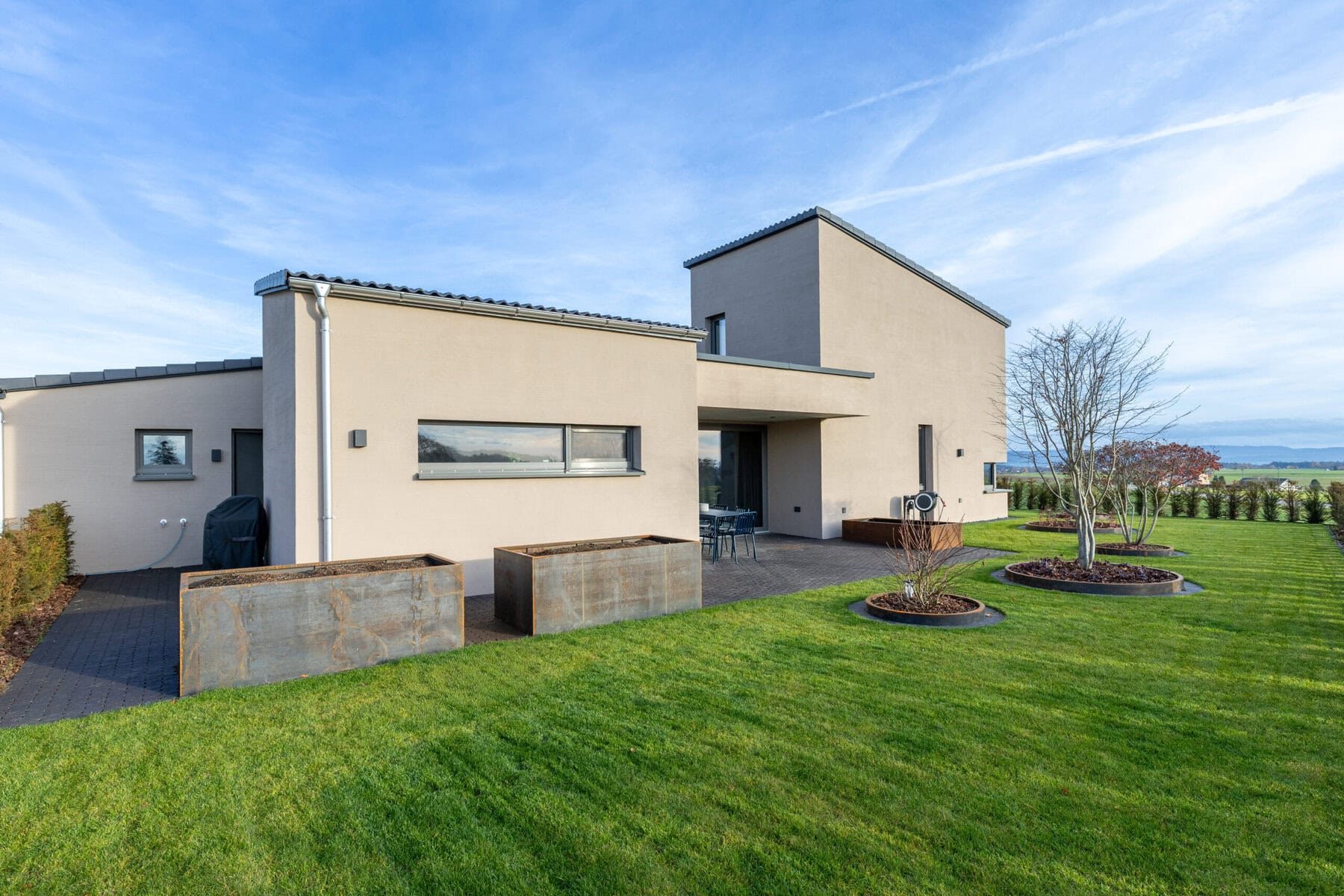 Inmitten der grünen Wiese eines Neubaugebiets sollte ein Wohnhaus entstehen, dass sich von der umgebenden Uniformität der Bebauung abhebt. Nicht nur in der Formgebung, sondern auch in der Materialität wird hier der Grundriss neu gedacht.